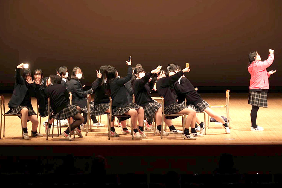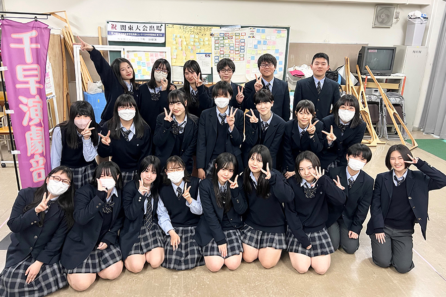 本校の演劇部には決まった台本がなく、部員一人一人がアイディアを出し合いながら芝居創りに励む「集団創作」という手法で創作をしています。そのため一般的な「演劇」のイメージとは異なる部分も多いかもしれません。週3回の活動日には発声練習もなければ呼吸や滑舌トレーニング、体力づくりのための筋トレ等も一切なく、部員は活動場所に集まるや否や思い思いの場所でおしゃべりに花を咲かします。でもその何気ない「おしゃべり」こそが大切で、学校生活や家、アルバイト、好きな人のことなど話題は多岐にわたり、そのどれもが彼女たちにとって身近なものばかりなのです。そしてそこで出てきた話題からヒントを得て1つのシーンとし、それらを積み重ねることで作品を完成させていきます。つまり本校の作品は紛れもなく「千早高校生の日常」そのままなのです。その意味で「状況報告演劇」とも呼んでいます。