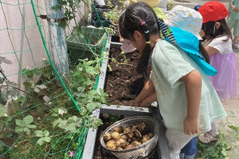 本校園芸部は「生命あるものを大切にし心を育む」「地域と連携し、生徒の自主性・主体性を育む」を活動方針として、年間を通じた多様な園芸活動と地域貢献に取り組んでいます。部員は部員同士で相談して年間計画を立て、季節に応じた野菜や花を育て、種まきから収穫、販売、寄付までの一連の流れを主体的に行っています。活動の大きな特色は、栽培した作物を地域とつなげて活用している点です。きゅうりやジャガイモなどを育てた際には、隣接する保育園と連携し、園児とともに収穫体験を行っています。園児が土に触れ、食べ物が育つ過程を学ぶことで、命の尊さや自然への関心を高める貴重な場となっており、収穫した野菜は保育園へ無償で提供しています。