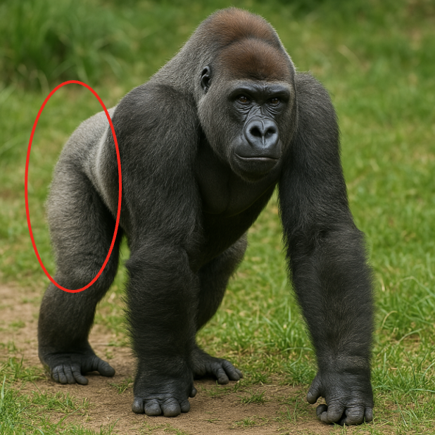 人間が歩いている時は、本来、筋肉の過剰な活動はみられず、非常に効率の良い移動様式となっています。しかし、猿類・ゴリラの歩行は前方に進もうとするはずなのに、左右に大きく重心移動が生じ、中殿筋、外側広筋、大腿二頭筋、腓腹筋外側頭など、下肢の外側の筋活動を必要とします。すなわち、過剰な筋活動=エネルギー効率が悪いため、長距離の歩行は苦手となります。(ゴリラの行動範囲は2km/日)ゴリラが歩くとき、手を使ったナックルウォーキングを行うのは、四足歩行のなごりでもありますが、推進力や制動力よりも重心支持と安定性に重点を置いた移動様式であり、人間にとっての杖のような役割となります。