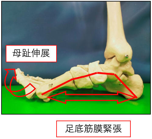 足部の内側では、母趾が伸展(反り返り)することで足裏の足底筋膜が緊張します。足底筋膜の張力が高まることで、足のアーチが強固になり、歩行時に踵が上がった際の蹴り出しによる出力を発揮することができます。外反母趾がある場合はこのウィンドラス機構が正しく機能せず、歩行時の前方への推進力が低下します。