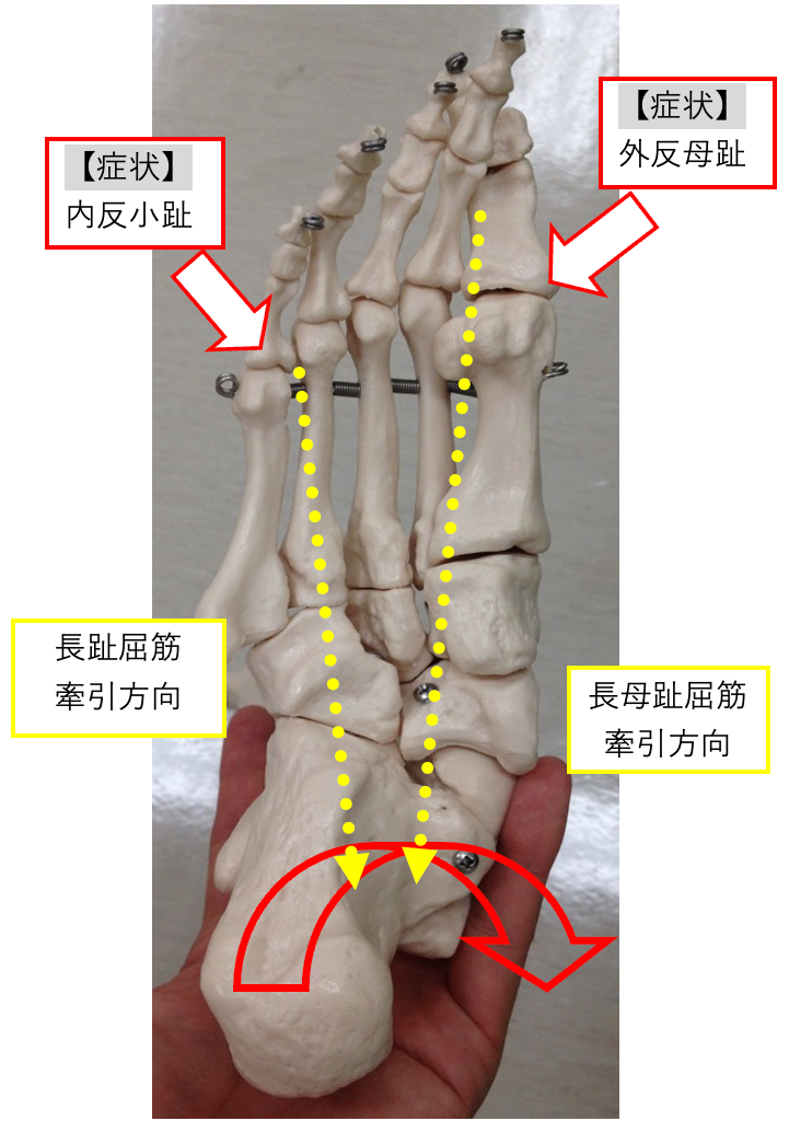 外反母趾や内反小趾は、足趾だけの問題ではありません。実際には、足部全体の骨格変化が大きく関与しており、足幅の拡大や踵骨・距骨の位置変化が主な原因となることが多いです。特に踵骨が内側に傾くことで、第5趾骨が内側に傾斜をして、第4趾と接触してしまいます。第5趾の位置が変化することで、足趾の筋腱の牽引方向が変化し、症状が悪化する要因となります。
