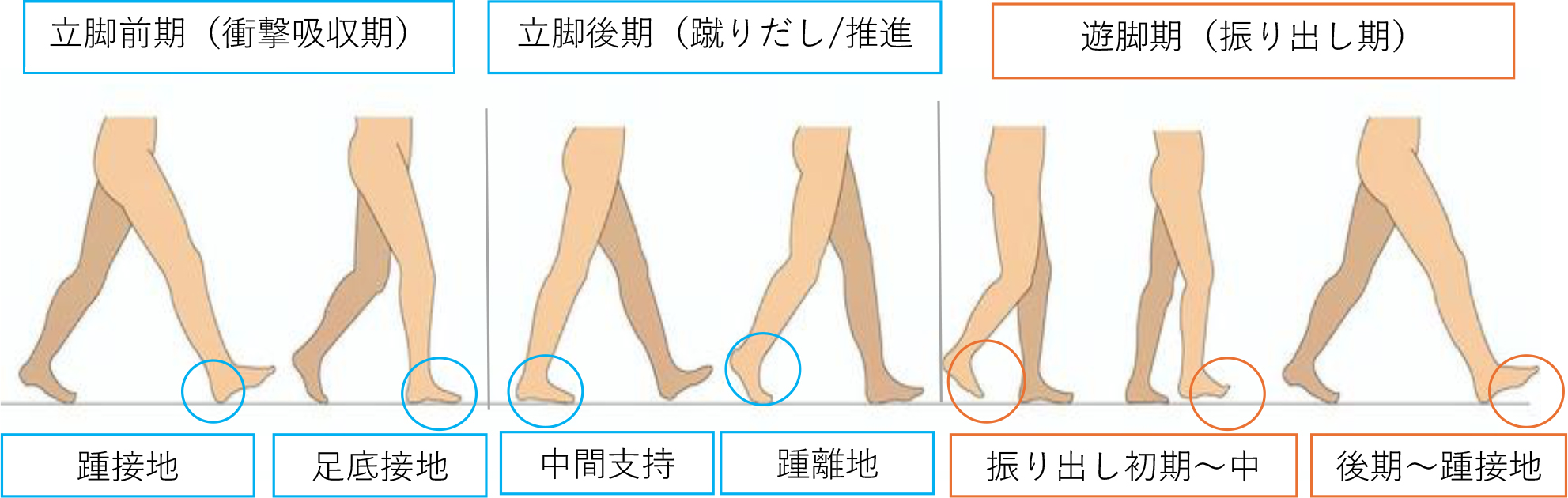 人間の二足歩行は、足が床面に接地している「立脚期」と、床面から離れて足を振り出す「遊脚期」に分けられます。 立脚期では、踵から接地し、足底全体が地面に触れることで膝が伸展します。その後、反対側の足が前方に振り出され、接地と同時に踵が持ち上がり、つま先が地面から離れるまで、足圧中心は踵の外側から母趾へと移動していきます。