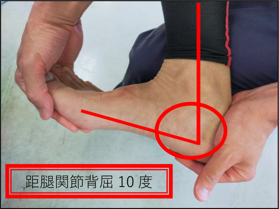 | 足首背屈テスト | 距腿関節の可動性 | 踵を固定し母趾球を持って反らす | 10度以上 |