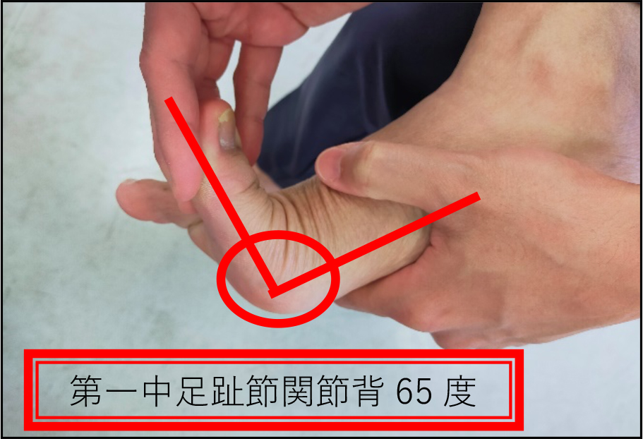 | 母趾背屈テスト | 母趾の可動性 | 母趾球を固定し母趾を反らす | 65度以上 |